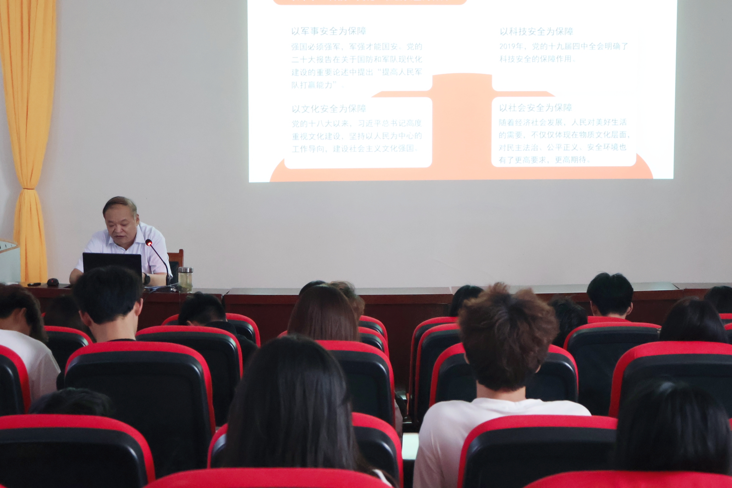 陈立新书记围绕总体国家观的提出及其内涵、我国国家安全体系建设取得的突出成绩、防范化解重点领域风险、新时代国家安全工作的战略部署等4个方面,理论联系实际,深入浅出地为同学们讲授了总体国家安全观的相关知识。