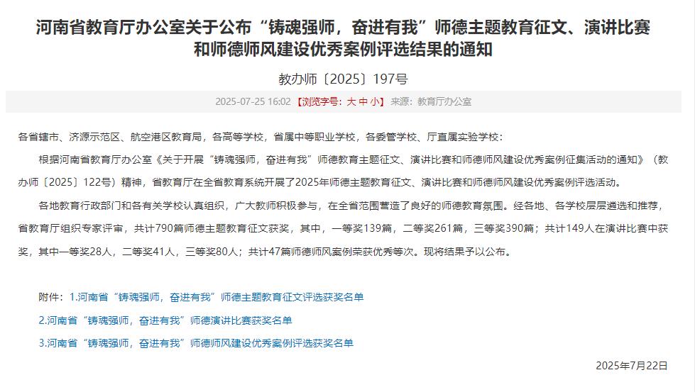 近日,河南省教育厅办公室发布了《关于开展“铸魂强师,奋进有我”师德教育主题征文、演讲比赛和师德师风建设优秀案例征集活动的通知》(教办师〔2025〕122号),我校教师在征文活动中荣获一等奖1项,二等奖2项,三等奖1项。