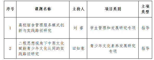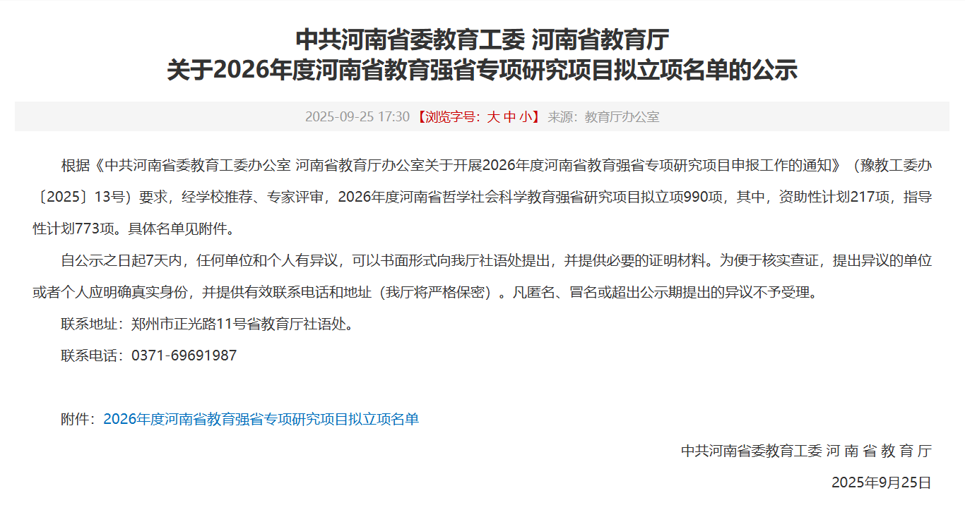 近日,河南省教育厅对“2026年度河南省教育强省专项研究项目拟立项名单”进行公示,我校共有2项课题成功获批,具体立项名单见下表。