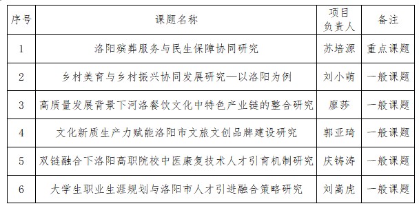 日前,洛阳市社会科学规划评审办公室发布了2025年洛阳市社会科学规划项目拟立项项目公示》,我校有6项课题入选,其中1项重点课题,5项一般课题,具体如下: