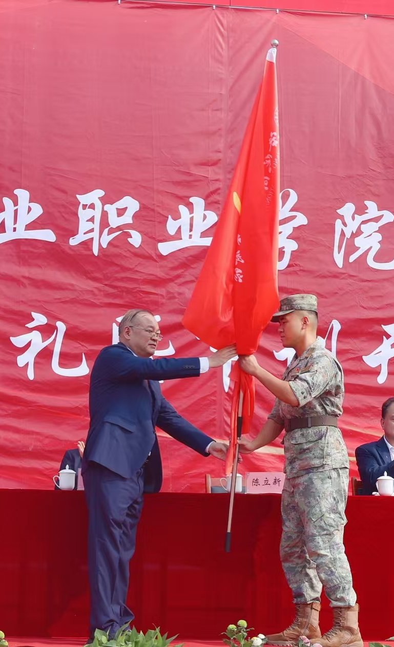 陈立新宣布军训开训,向军训团授旗,学校2024级学生军训工作正式开启。(撰稿/李园园 审核/张文静)