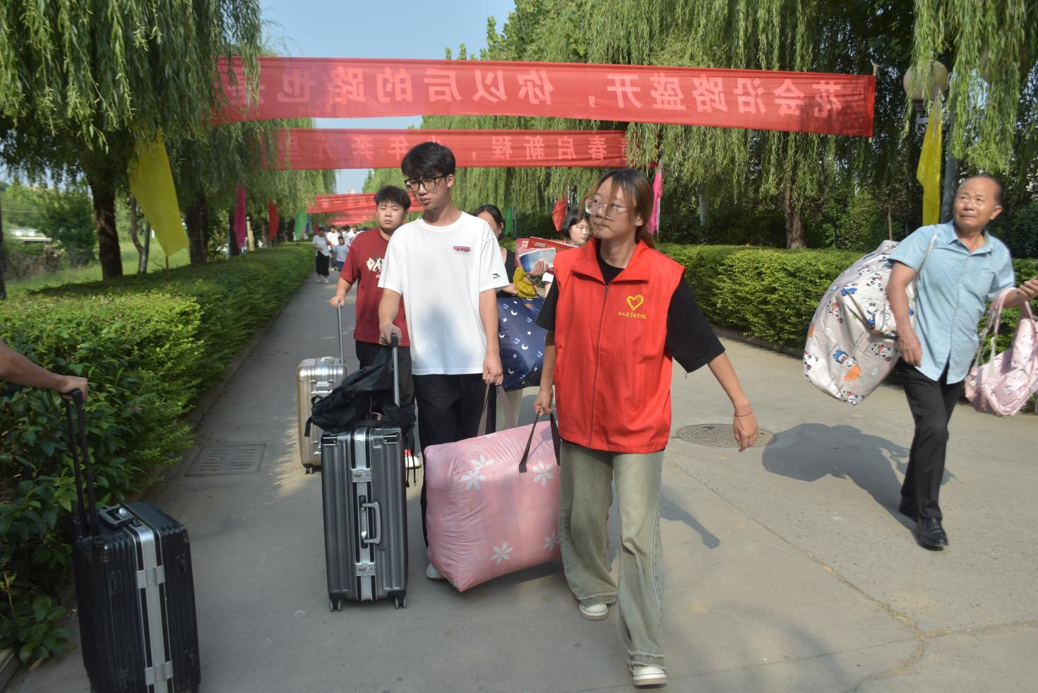 在校园里,“热烈欢迎2024级新同学”“热爱可抵漫长岁月,洛商与你来日方长”等迎新条幅处处渲染着校园喜庆欢快的氛围。身穿红马甲的志愿者随处可见,从各项报到入学手续的办理,到新生行囊的搬运,再到校园路线的指引,处处细节,件件暖心,真正将“接过你的行囊,我们就是一家人”的真谛融入到每一处的耐心细致地服务中去。