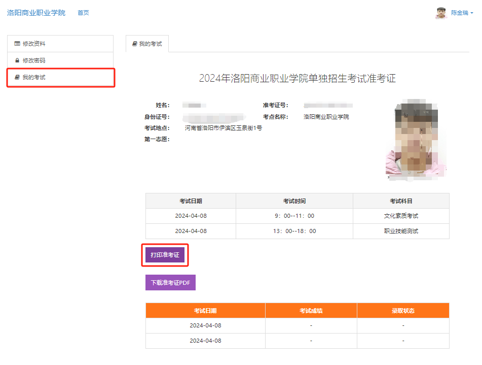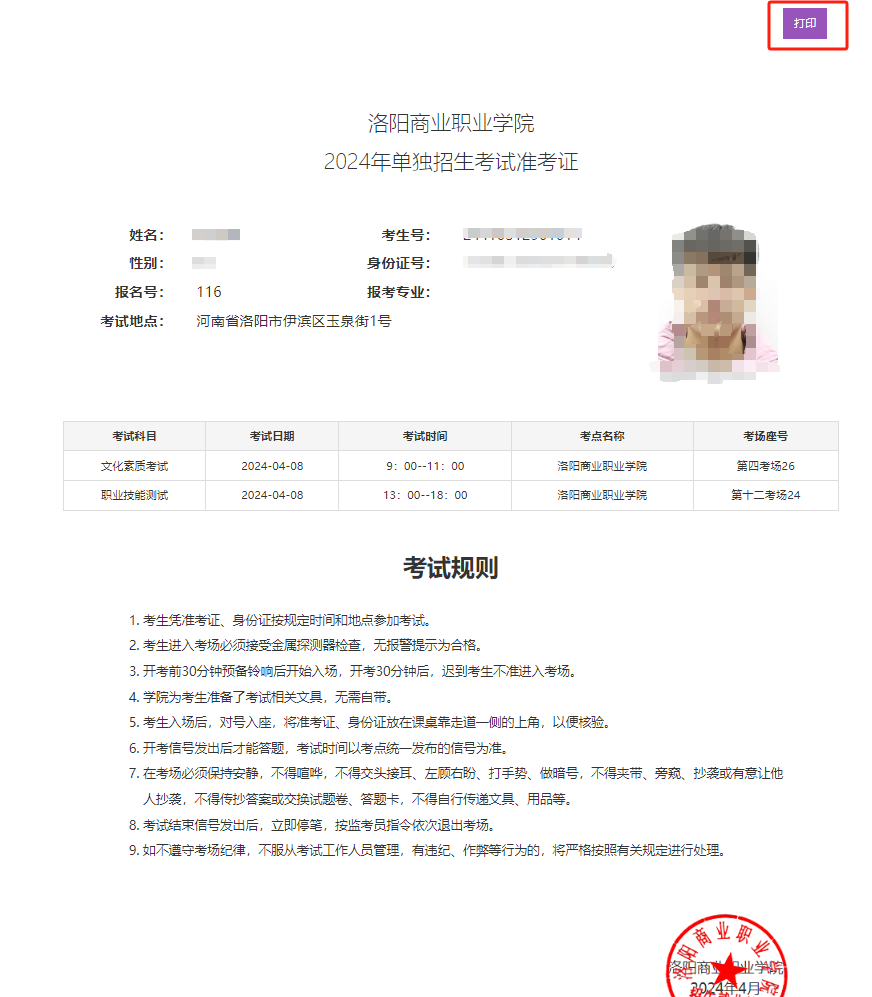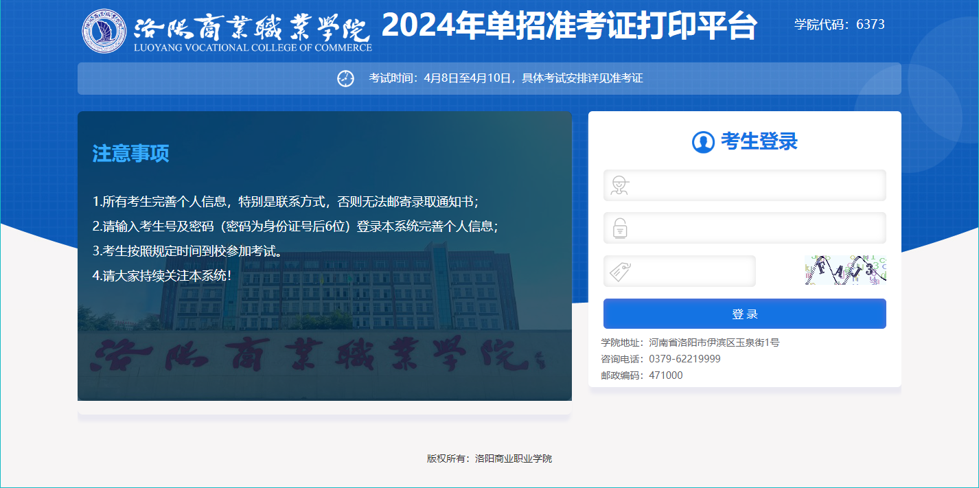 我院单独考试招生准考证打印系统已开放,请广大考生登录系统完善个人信息后,自行下载并打印准考证,如有疑问请联系:0379-62219999。